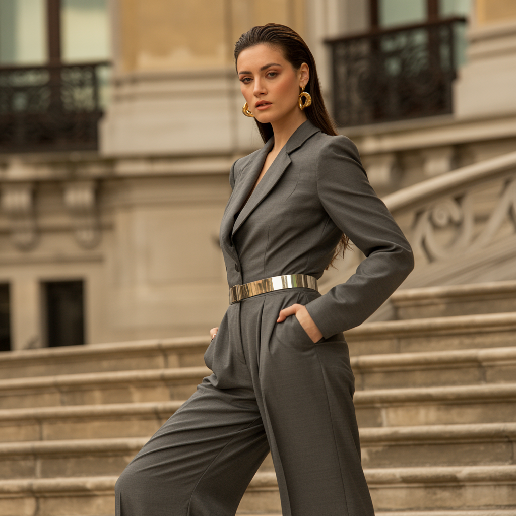 Satin V-Neck Wide-Leg Jumpsuit with Belted Waist